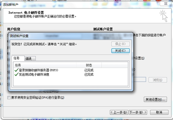 點擊“下一步”,系統會自動進行檢測,成功后顯示界面如下。然后點擊“關閉”即可完成設置。