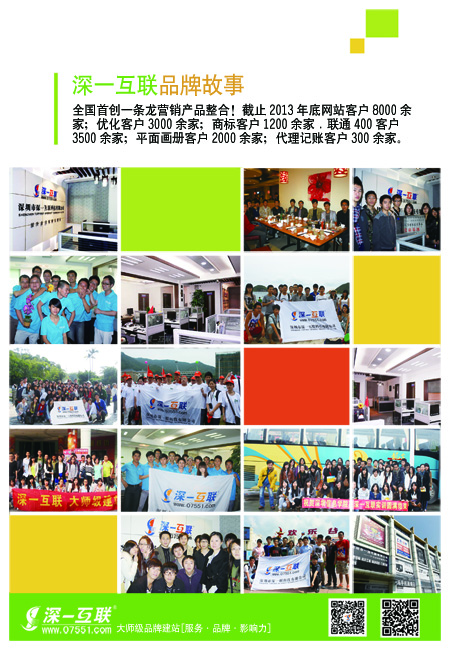 全國首創(chuàng)一條龍營銷產(chǎn)品整合!截止2013年底網(wǎng)站客戶8000余家;優(yōu)化客戶3000余家;商標客戶1200余家.聯(lián)通400客戶3500余家;平面畫冊客戶2000余家;代理記賬客戶300余家。